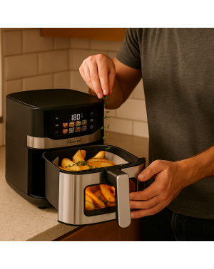 La freidora de aire NF19 de 8L es ideal para quienes buscan gran capacidad y resultados profesionales en la cocina diaria. Con sus 2200W y cocción 360° 3D, garantiza platos crujientes por fuera y jugosos por dentro, reduciendo hasta un 85% de grasa. Su panel digital táctil con 10 menús automáticos y ventana visible aporta comodidad y control total. Con cavidad metálica, doble grill, seguridad integrada y fácil limpieza en lavavajillas, es la elección perfecta para familias y amantes de la cocina práctica, saludable y moderna.