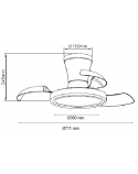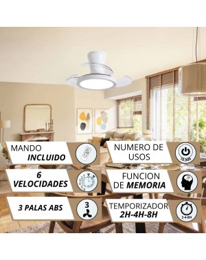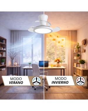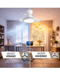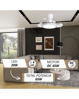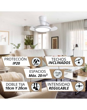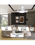 Te presentamos un ventilador de diseño moderno y funcional, ideal para cualquier espacio. Con un chasis de policarbonato color BLANCO, y palas transparentes retráctiles, ofrece ligereza pero una muy buena presencia, y un rendimiento eficiente con un motor DC de bajo consumo (24W) y 460 RPM. Su fuente de luz LED de intensidad regulable (20W) permite ajustar la temperatura de color (3000K-4200K-6500K), mientras que su memoria de color mantiene la luz constante.