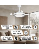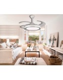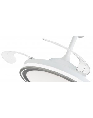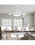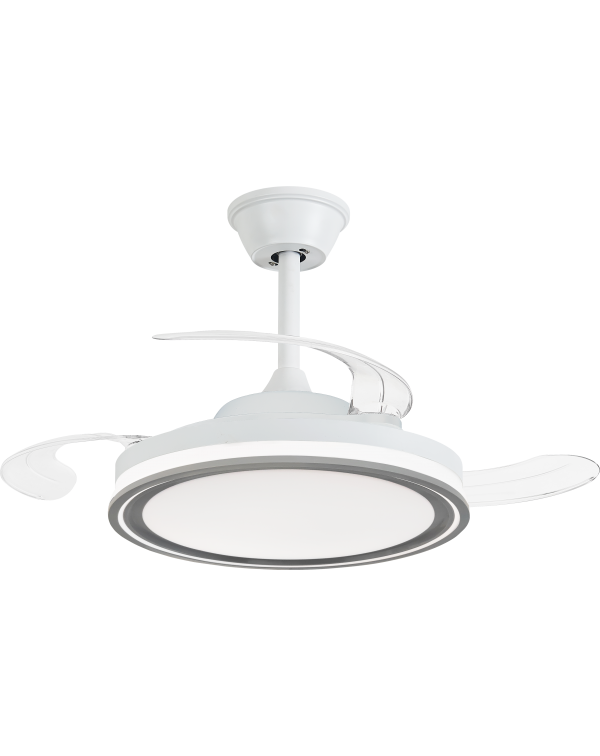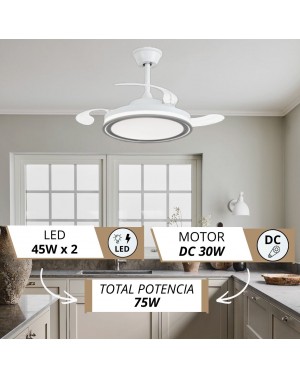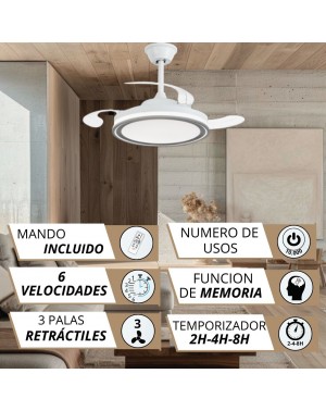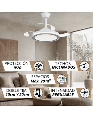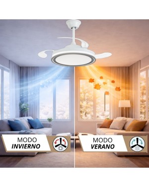 Su función invierno/verano, memoria de configuración y mando distancia hacen su uso aún más práctico. ¡Ideal para cualquier espacio moderno! Te presentamos un ventilador de diseño moderno y funcional, ideal para cualquier espacio. Con un chasis de policarbonato blanco con un interior de un gris sutil y unas palas transparentes, ofrece ligereza pero una muy buena presencia, y un rendimiento eficiente con un motor DC de bajo consumo (<30W) y 253 RPM. Su fuente de luz LED regulable (45W x 2) permite ajustar la temperatura de color (3000K-4200K-6500K), mientras que su memoria de color mantiene la luz constante. Tiene 3 palas retráctiles, 6 velocidades ajustables y control de aire para verano e invierno, ofrece versatilidad durante todo el año. Además, incluye temporizador (2, 4, 8 horas) y mando a distancia. Su altura ajustable y su flujo de iluminación de 6.480 lúmenes lo hacen perfecto para cualquier habitación, con una vida útil de 30.000 horas. Con un peso neto de 5,7 kg y un diseño fácil de instalar, es la opción ideal para tu hogar u oficina.