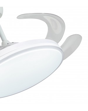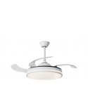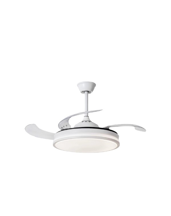 Te presentamos un ventilador de diseño moderno y funcional, ideal para cualquier espacio. Con un chasis de policarbonato color BLANCO, y palas transparentes retráctiles, ofrece ligereza pero una muy buena presencia, y un rendimiento eficiente con un motor DC de bajo consumo (<30W) y 253 RPM. Su fuente de luz LED de intensidad regulable (45W x 2) permite ajustar la temperatura de color (3000K-4200K-6500K), mientras que su memoria de color mantiene la luz constante.