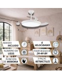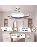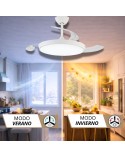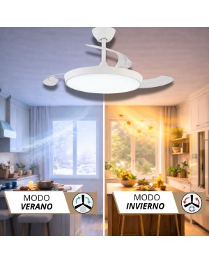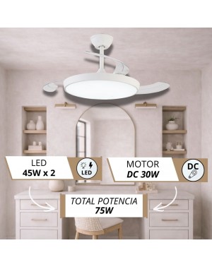 Te presentamos un ventilador de diseño moderno y funcional, ideal para cualquier espacio. Con un chasis de policarbonato color Blanco, y palas transparentes retráctiles, ofrece ligereza pero una muy buena presencia, y un rendimiento eficiente con un motor DC de bajo consumo (<30W) y 253 RPM. Su fuente de luz LED de intensidad regulable (45W x 2) permite ajustar la temperatura de color (3000K-4200K-6500K), mientras que su memoria de color mantiene la luz constante.