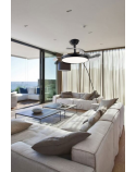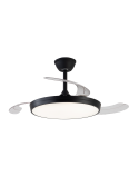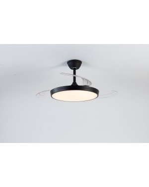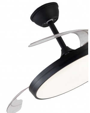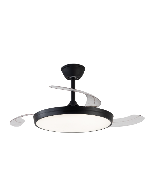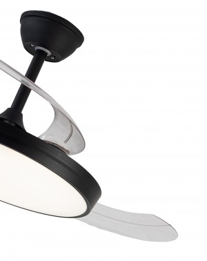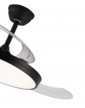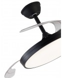Te presentamos un ventilador de diseño moderno y funcional, ideal para cualquier espacio. Con un chasis de policarbonato color negro, y palas transparentes retráctiles, ofrece ligereza pero una muy buena presencia, y un rendimiento eficiente con un motor DC de bajo consumo (<30W) y 253 RPM. Su fuente de luz LED de intensidad regulable (45W x 2) permite ajustar la temperatura de color (3000K-4200K-6500K), mientras que su memoria de color mantiene la luz constante.