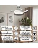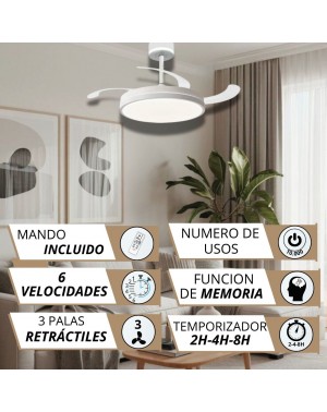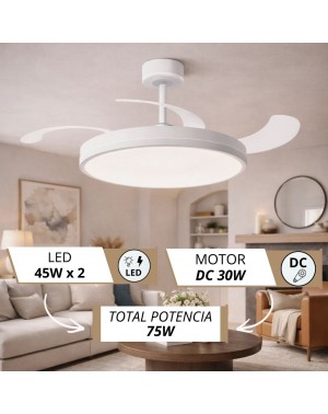 Te presentamos un ventilador de diseño moderno y funcional, ideal para cualquier espacio. Con un chasis de policarbonato , con unas tiras iluminadas y un cabezal iluminado que funciona de forma independiente , con 3 tonos de luz (3000K, 4200K-6000K) y accionamiento del cabezal desde el mando a distancia, que realzan la elegancia del armazón a la vez que lo hacen más luminoso. Sus 3 palas transparentes retráctiles, ofrece ligereza pero una muy buena presencia, y un rendimiento eficiente con un motor DC de bajo consumo (<30W) y 253 RPM. Su fuente de luz LED de intensidad regulable (45W x 2) permite ajustar la temperatura de color (3000K-4200K-6500K), mientras que su memoria de color mantiene la luz constante.