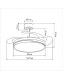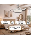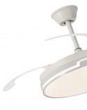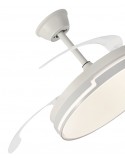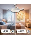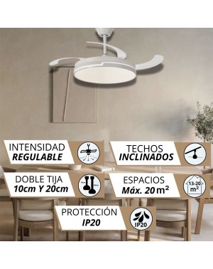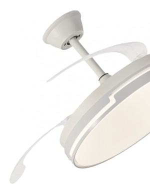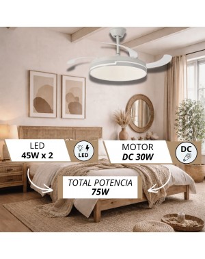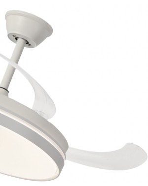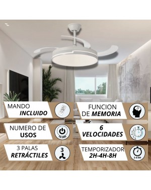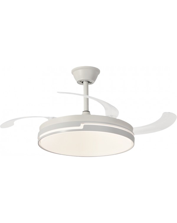 Te presentamos un ventilador de diseño moderno y funcional, ideal para cualquier espacio. Con un chasis de policarbonato color Blanco, y 3 palas transparentes retráctiles, ofrece ligereza pero una muy buena presencia, y un rendimiento eficiente con un motor DC de bajo consumo (<30W) y 253 RPM. Su fuente de luz LED de intensidad regulable (45W) permite ajustar la temperatura de color (3000K-6500K), mientras que su memoria de color mantiene la luz constante.