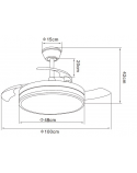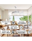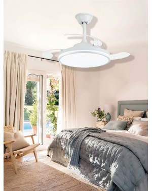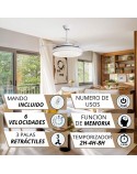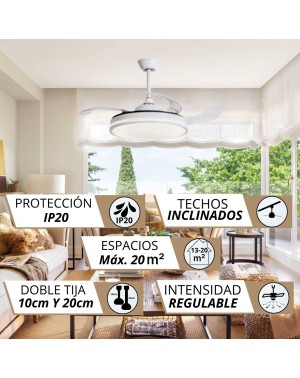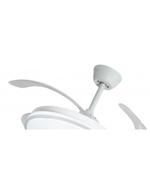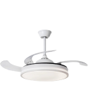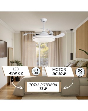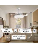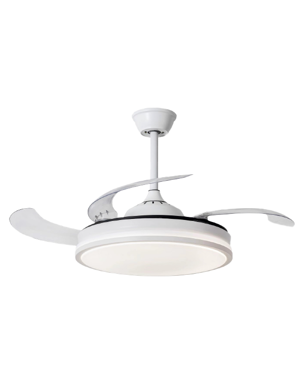 Te presentamos un ventilador de diseño moderno y funcional, ideal para cualquier espacio. Con un chasis de policarbonato color BLANCO, y palas transparentes retráctiles, ofrece ligereza pero una muy buena presencia, y un rendimiento eficiente con un motor DC de bajo consumo (<30W) y 253 RPM. Su fuente de luz LED de intensidad regulable (45W x 2) permite ajustar la temperatura de color (3000K-4200K-6500K), mientras que su memoria de color mantiene la luz constante.