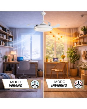 Tiene 3 palas retráctiles, 6 velocidades ajustables y control de aire para verano e invierno, ofrece versatilidad durante todo el año. Además, incluye temporizador (2, 4, 8 horas) y mando a distancia. Su altura ajustable y su flujo de iluminación de 6.480 lúmenes lo hacen perfecto para cualquier habitación, con una vida útil de 30.000 horas. Con un peso neto de 5,9 kg y un diseño fácil de instalar, es la opción ideal para tu hogar u oficina.